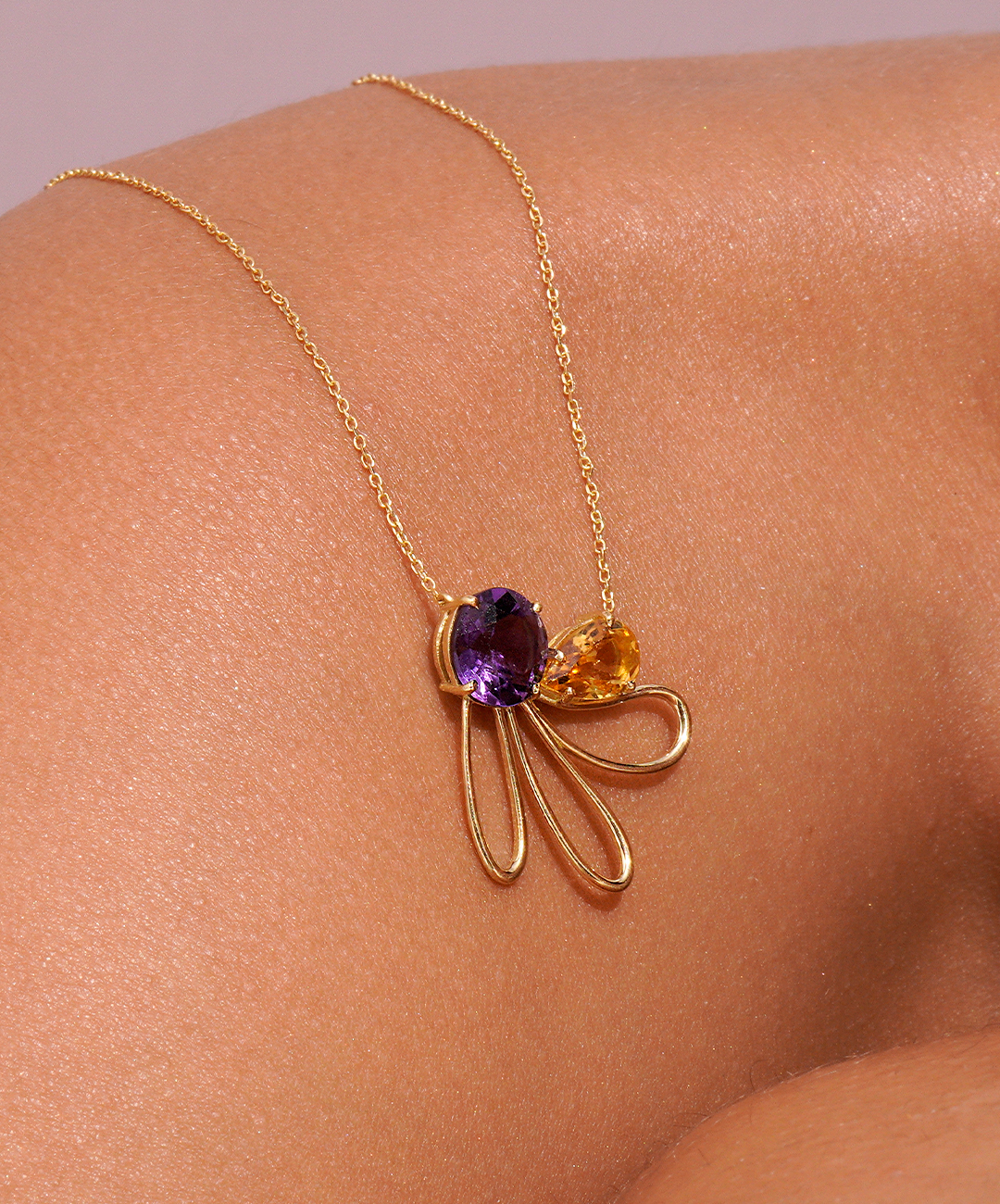 The Wing Necklace is part of the In Bloom Collection, created to connect us with the beauty of the natural world. Handcrafted in 18k yellow gold, amethyst and citrine